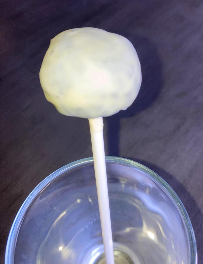 - Dip a lollipop stick into the melted candy melts and then insert it into the cake pop. Repeat.