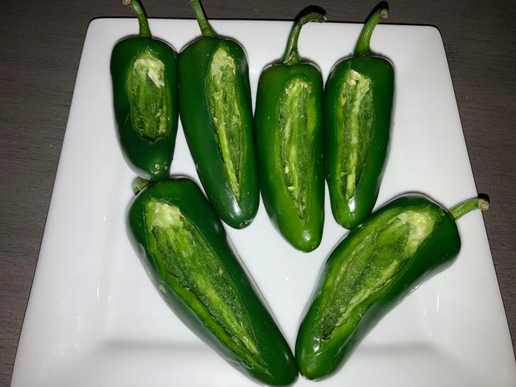 - Cut the jalapenos lengthwise as shown in the photo below. Carefully remove the seeds and membranes. (Remember to wash your hands after touching jalapeno seeds!)